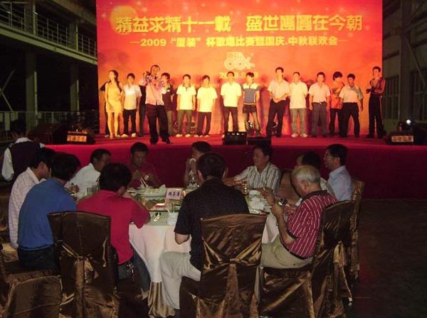 為喜迎“國慶·中秋”雙節(jié)的到來,慶祝廈裝公司成立11周年,廈裝公司于2009年9月29日舉行了規(guī)模盛大的“國慶·中秋”大聯(lián)歡活動。此次活動包括“歌唱祖國”歌唱比賽、頒獎儀式、文藝表演、中秋晚宴、中秋博餅等幾個環(huán)節(jié)。