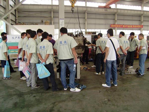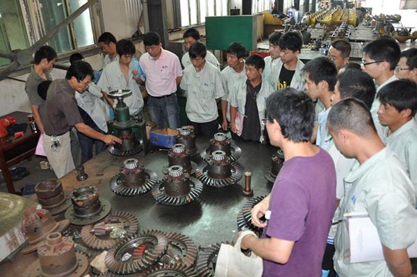 本次研討學(xué)習(xí)班共有來(lái)自全國(guó)各地區(qū)共計(jì)40名的一線服務(wù)人員參加。此次學(xué)習(xí)班,引起我司領(lǐng)導(dǎo)高度重視,不僅組織了相關(guān)部門領(lǐng)導(dǎo)系統(tǒng)授課:從新品介紹到各個(gè)機(jī)型的特點(diǎn),從發(fā)動(dòng)機(jī)故障判斷維修到管路液壓件原理介紹,從制動(dòng)系統(tǒng)學(xué)習(xí)到油缸的拆裝;而且與相關(guān)配套廠商協(xié)商,組織全體學(xué)員到相應(yīng)的工廠系統(tǒng)學(xué)習(xí)驅(qū)動(dòng)橋、變速箱、變矩器等主要零配件安裝維護(hù)課程!